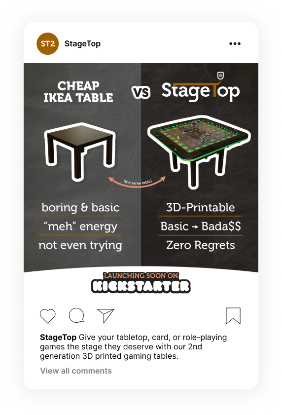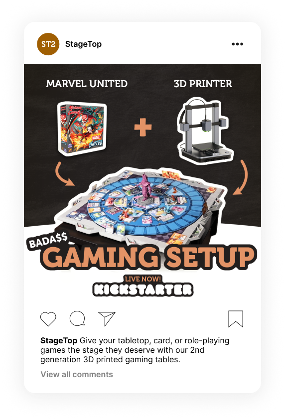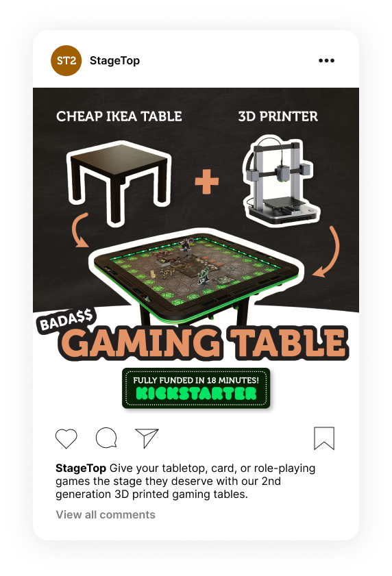 I helped get the leads for the StageTop 2 pre-launch start on Kickstarter. And helped with post-launch advertising. Overall $312,463 pledged out of $14,400 goal.